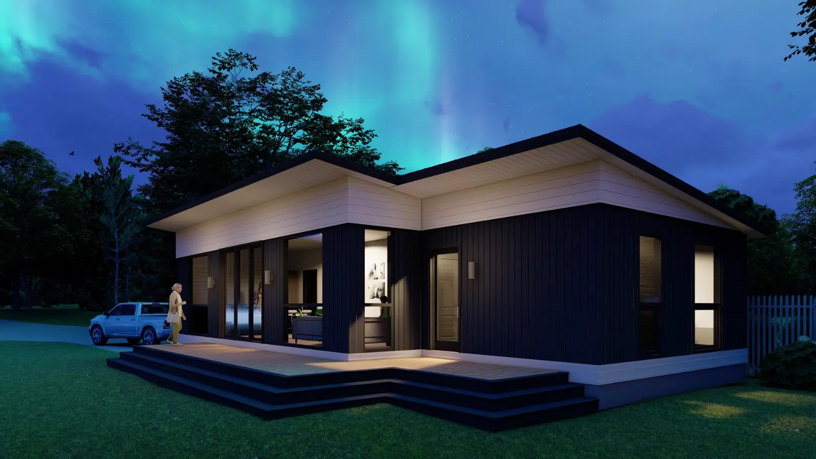 The Berkeley 1008 is a spacious 1008 sqft backyard garden suite designed for modern, independent living with a focus on comfort and flexibility. It includes 2 or 3 bedrooms, a full bathroom, and a half bathroom, making it ideal for growing families, rental opportunities, or private retreats. High sloped ceilings and an open concept layout create a bright, expansive interior, while large panoramic windows fill the space with natural light.